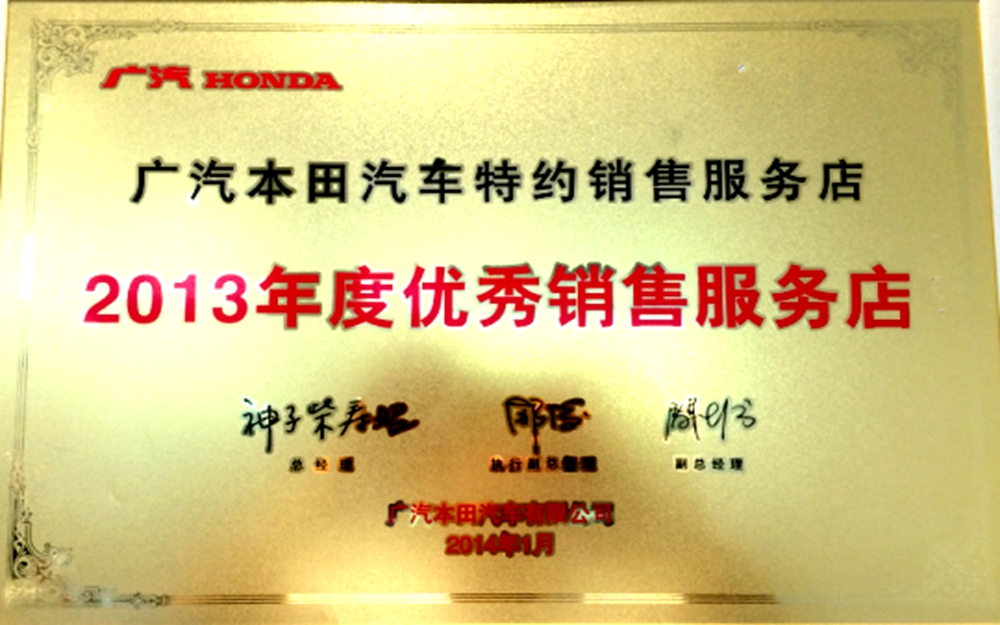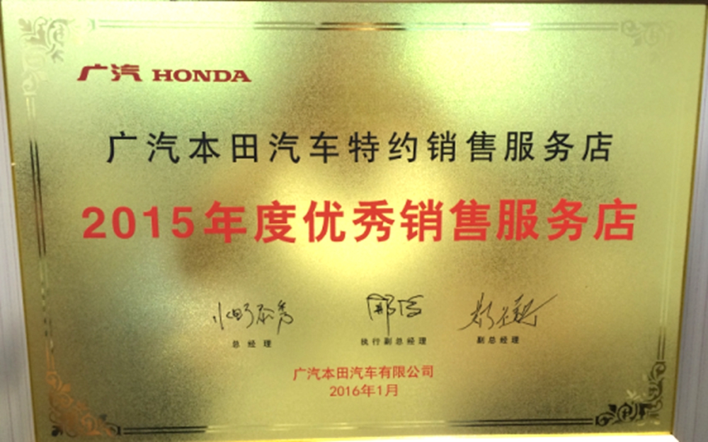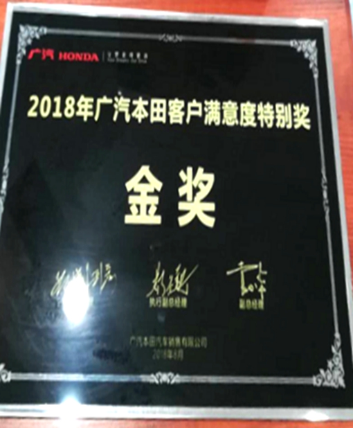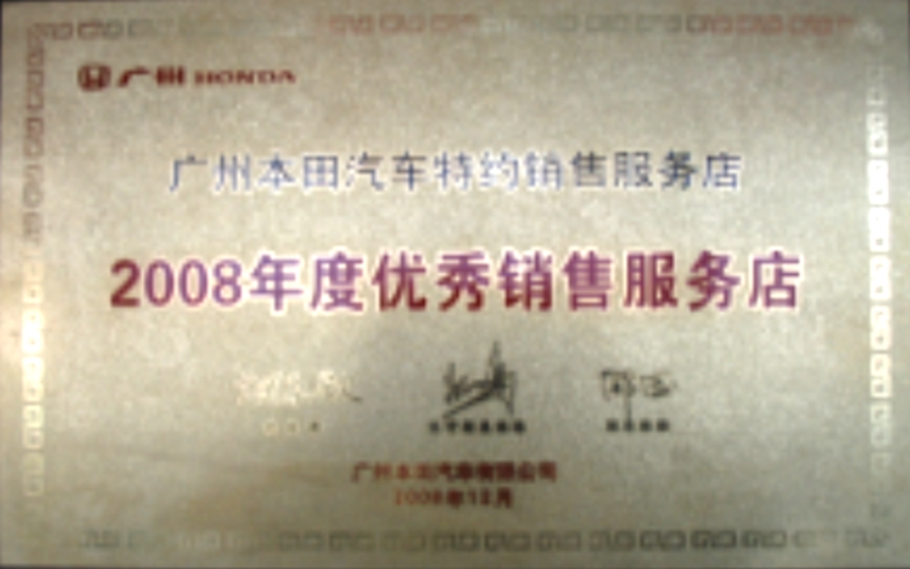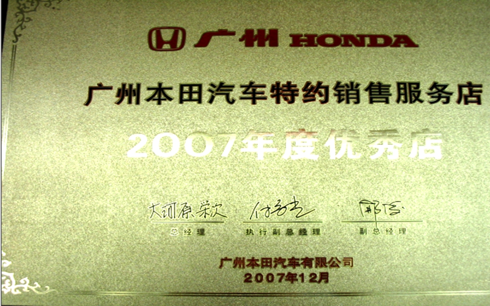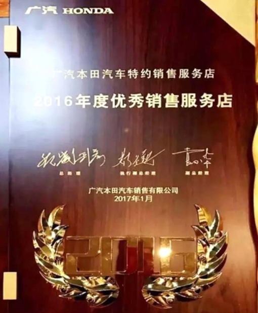 獲得廣州本田汽車優(yōu)秀服務(wù)店稱號。
