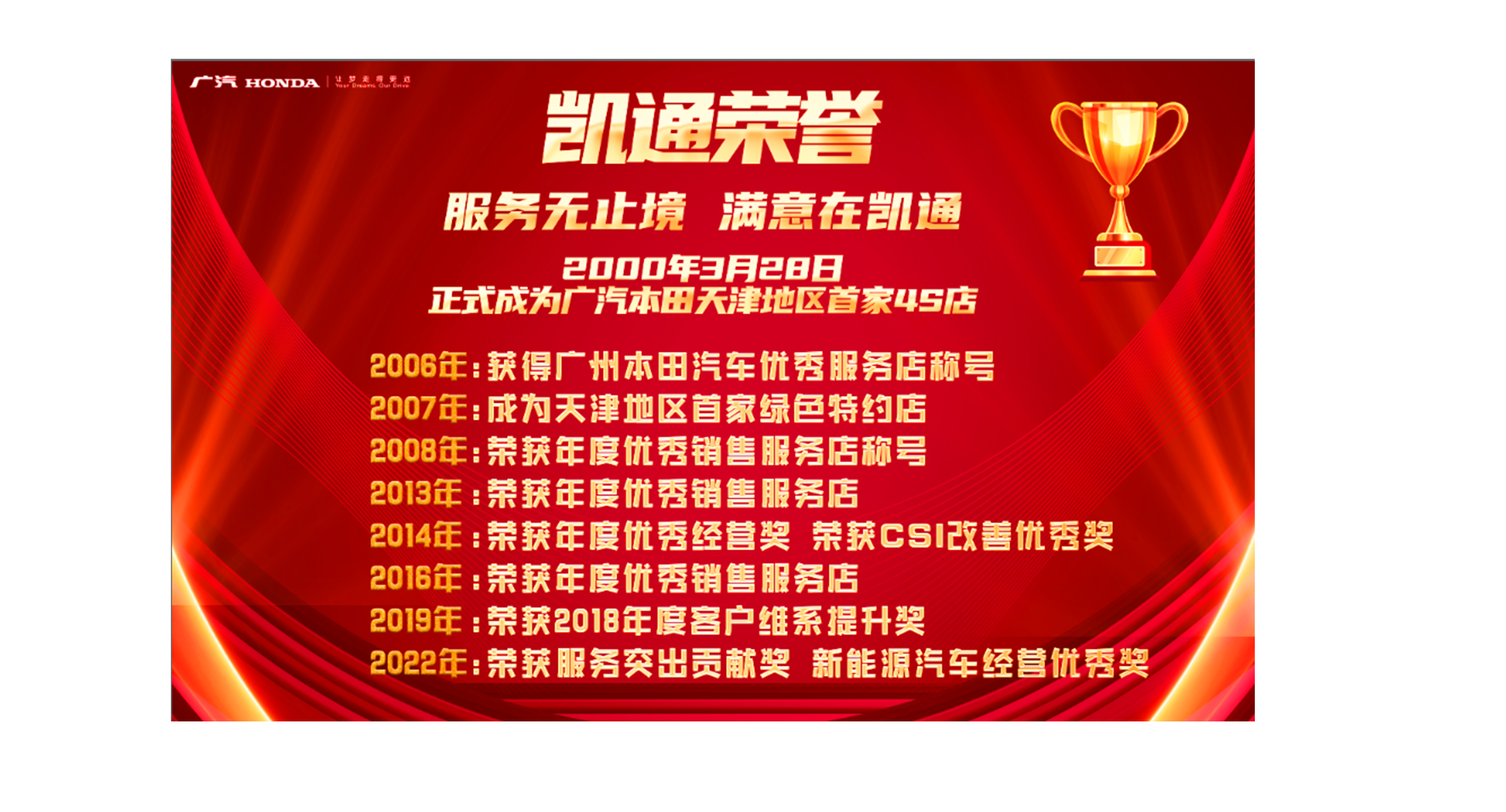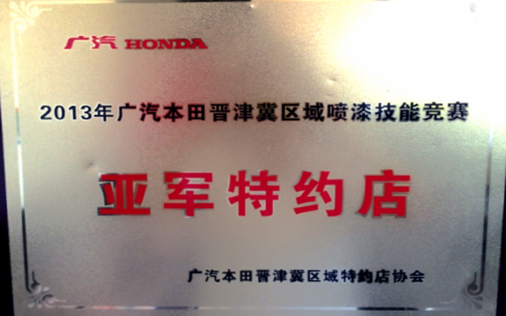 成為天津地區(qū)首家綠色特約店;榮獲廣州本田銷售精英大賽華北賽區(qū)—優(yōu)勝店稱號;榮獲年度優(yōu)秀店稱號。