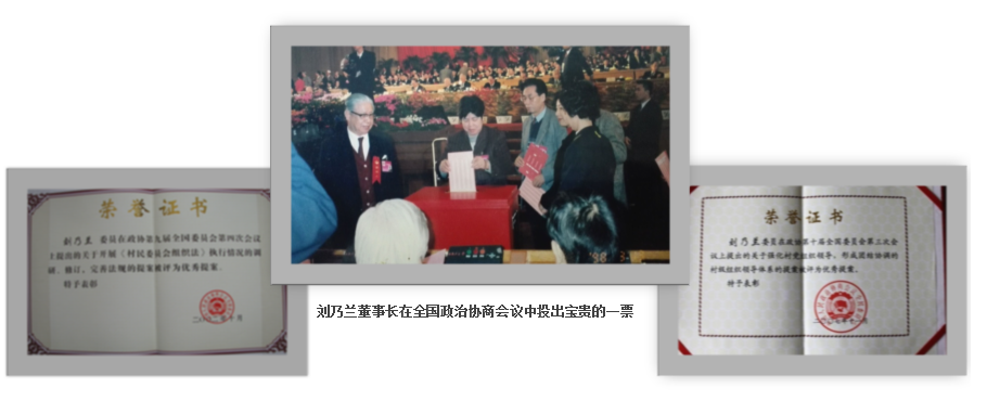 劉乃蘭董事長連續(xù)三屆當選全國政協(xié)委員(1998—2013年),為了加強參政議政能力,她經(jīng)常走進基層,了解難點、重點問題,深入調(diào)研、走訪、論證,以嚴謹負責的態(tài)度提出大量有價值、有分量、與時俱進、順應民生的優(yōu)秀提案。 15年來共向全國政協(xié)會議提交提案和大會發(fā)言近百份,其中《關(guān)于開展村民委員會組織法執(zhí)行情況的調(diào)研、修訂、完善法規(guī)》和《關(guān)于強化村黨組織領(lǐng)導,形成團結(jié)協(xié)調(diào)的村級組織體系》兩份提案獲得“全國優(yōu)秀提案獎” ,受到黨和國家的高度重視,體現(xiàn)了一名共產(chǎn)黨員與優(yōu)秀企業(yè)家的政治素養(yǎng)與普世情懷。